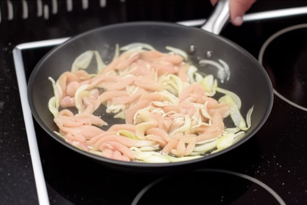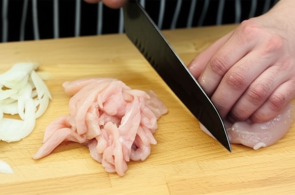 Cebulę i kurczaka w piersi pokrój na paski.