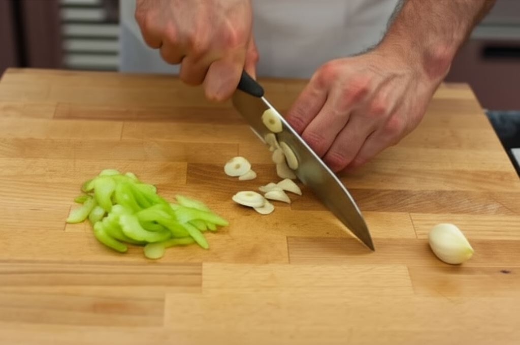 Posiekaj czosnek i cebulę, seler pokrój w drobną kostkę, a marchewkę zetrzyj na tarce. Wyjmij mięso z lodówki na godzinę przed smażeniem, by osiągnęło temperaturę pokojową.