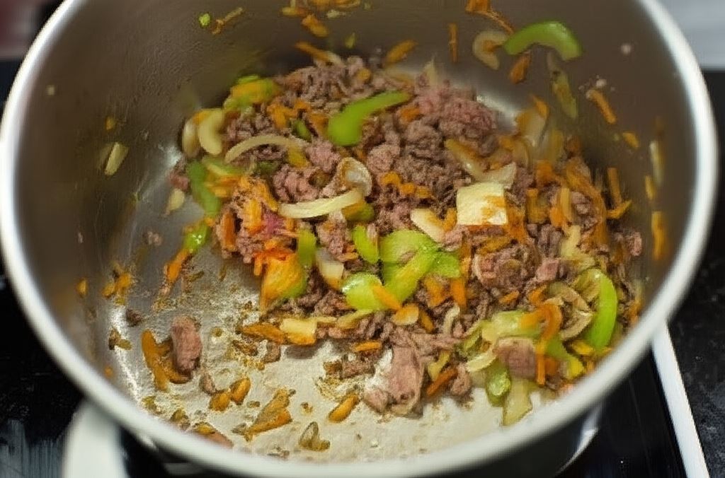 W szerokim garnku podsmażaj na oliwie warzywa. Po chwili wrzuć mięso. Smaż na wolnym ogniu i regularnie mieszaj, by nie powstały grudki.