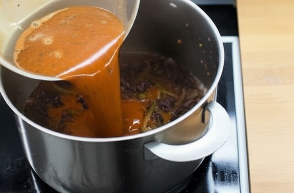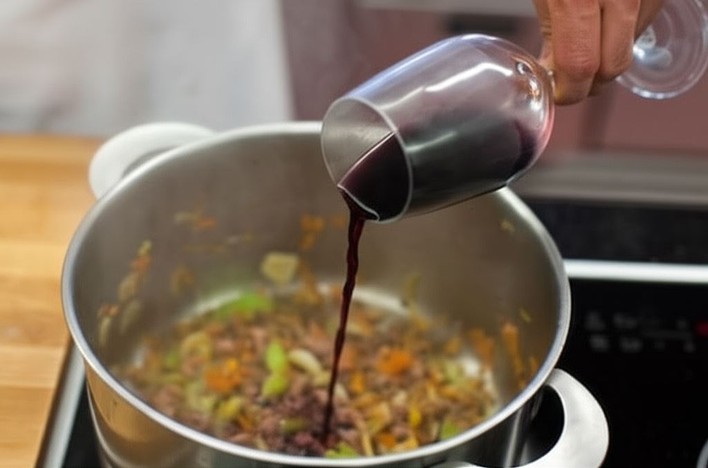 Gdy mięso się zarumieni, dodaj wino i odczekaj aż odparuje w połowie.