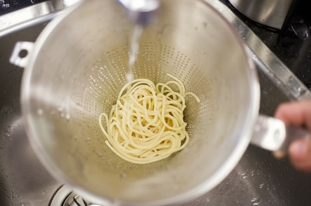 Przygotuj spaghetti al dente w sporej ilości osolonej, wrzącej wody. Potem odcedź na durszlaku i przepłucz zimną wodą.