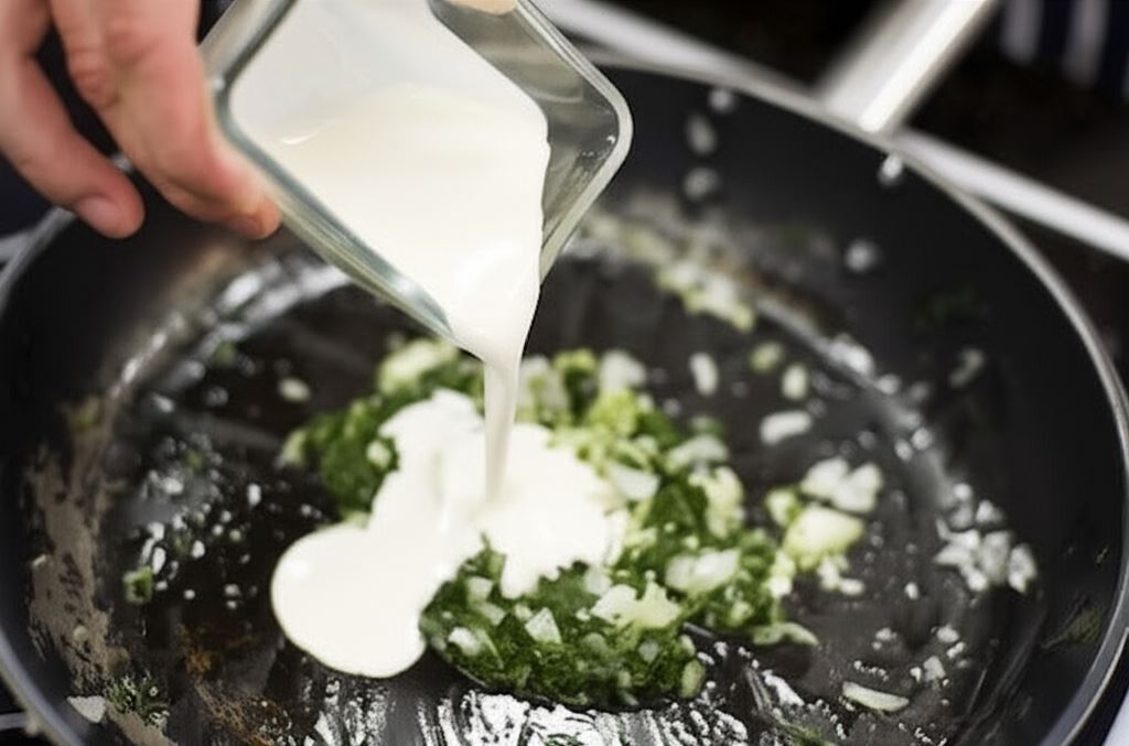 Wsyp szpinak i 50 ml śmietany. Wszystko gotuj na małym ogniu przez 5 minut. Przypraw według smaku, następnie zdejmij z patelni i odstaw w ciepłe miejsce.
