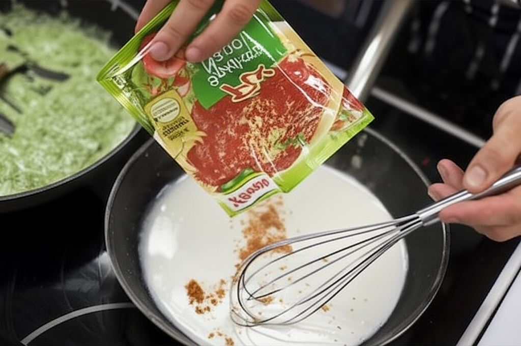 Dodaj na patelnię 250 ml zimnej wody oraz pozostałą śmietanę. Wsyp zawartość opakowania Fix Spaghetti Napoli Knorr, starannie wymieszaj i doprowadź do wrzenia, cały czas mieszając.