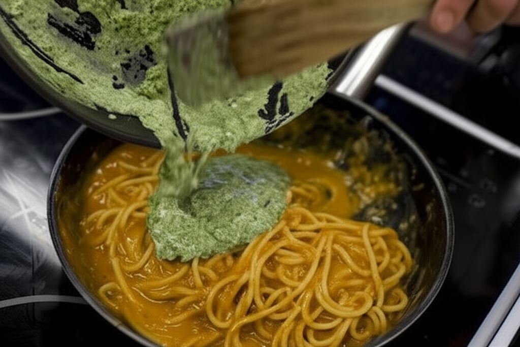 Wymieszaj spaghetti z sosem i szpinakiem, a następnie podawaj.