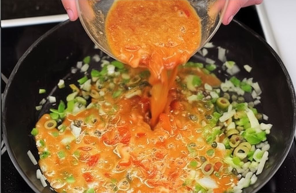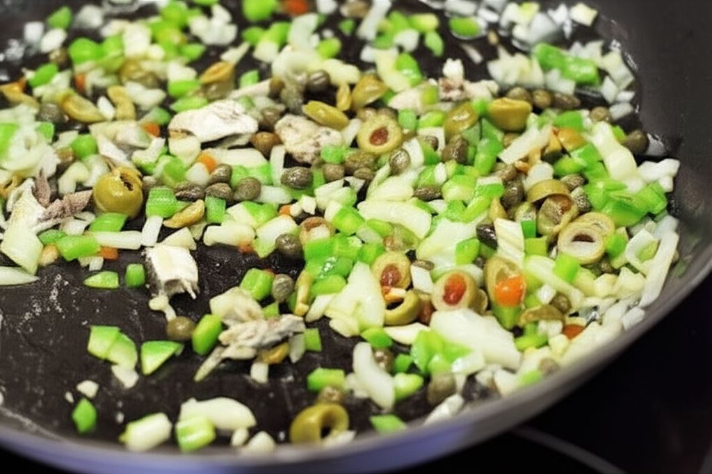 Cebulę i czosnek posiekaj na drobno i zesmaż na gorącej oliwie. Dodaj pokrojoną w kostkę paprykę, pokrojone na krążki oliwki, kapary oraz anchois.