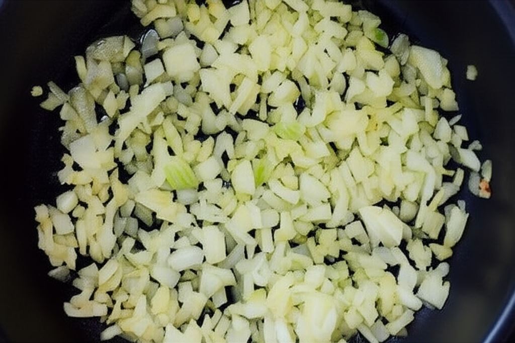Nagrzej suchą teflonową patelnię, po czym skrop ją oliwą z oliwek. Wsyp pokrojoną w kostkę cebulę i posiekany czosnek, następnie podsmażaj do zeszklenia.