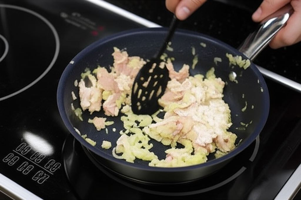 Przenieś na patelnię mielone mięso z piersi indyka i smaż około 4 min., nieustannie mieszając.