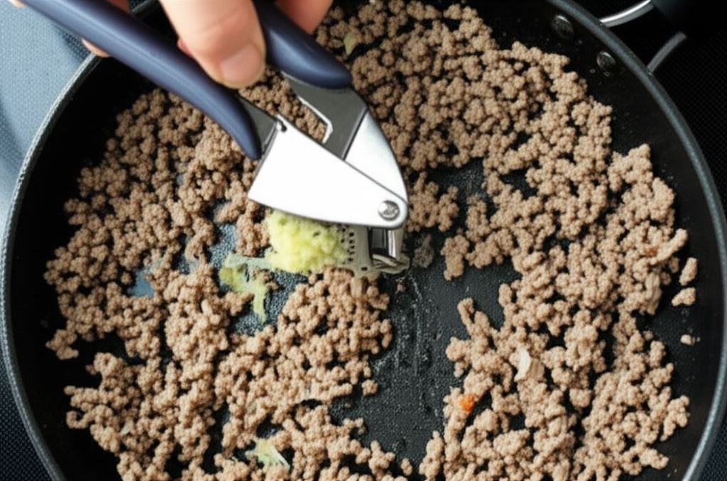 Czosnek obierz i przepuść przez praskę, a następnie dodaj do mięsa. Potem mięso zalej Sosem do pieczeni ciemnym Knorr, przygotowanym zgodnie z przepisem na opakowaniu i duś przez około 5 minut.