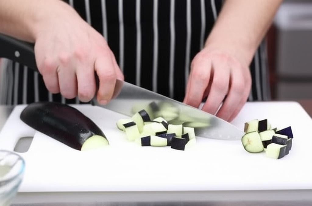 Warzywa (bakłażana, pomidory, paprykę) opłucz i pokrój w kostkę. Czosnek obierz, posiekaj i zrumień na oleju.