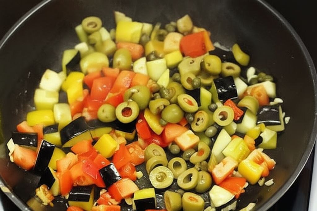 Do przysmażonego czosnku wsyp warzywa, pocięte oliwki i kapary.