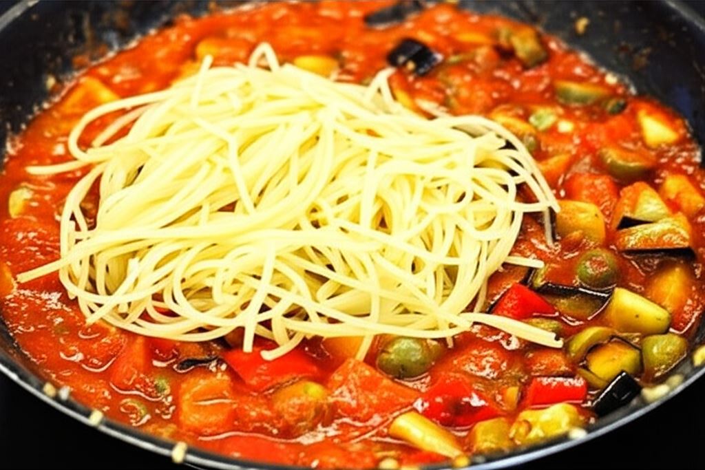 Aromatyczne spaghetti z oliwkowym sosem to prawdziwa uczta dla podniebienia. Soczyste pomidory, bakłażan i papryka tworzą idealną bazę dla tego dania, a dodatek oliwek i kaparów przenosi nas prosto na słoneczne wybrzeże Włoch. Makaron al dente, oblany pachnącym sosem i posypany serem, staje się daniem, któremu trudno się oprzeć.