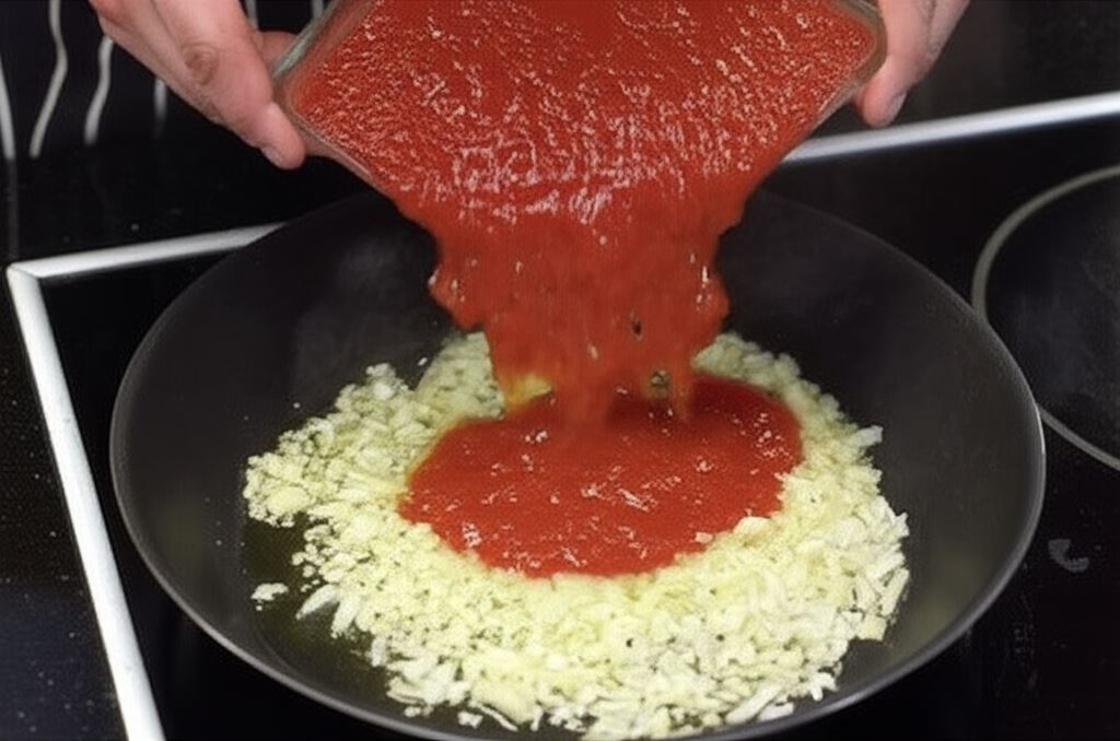 Cebulę z czosnkiem podsmażaj. Kiedy zrumieni się, wsyp pokrojone pomidory z puszki razem z sokiem.