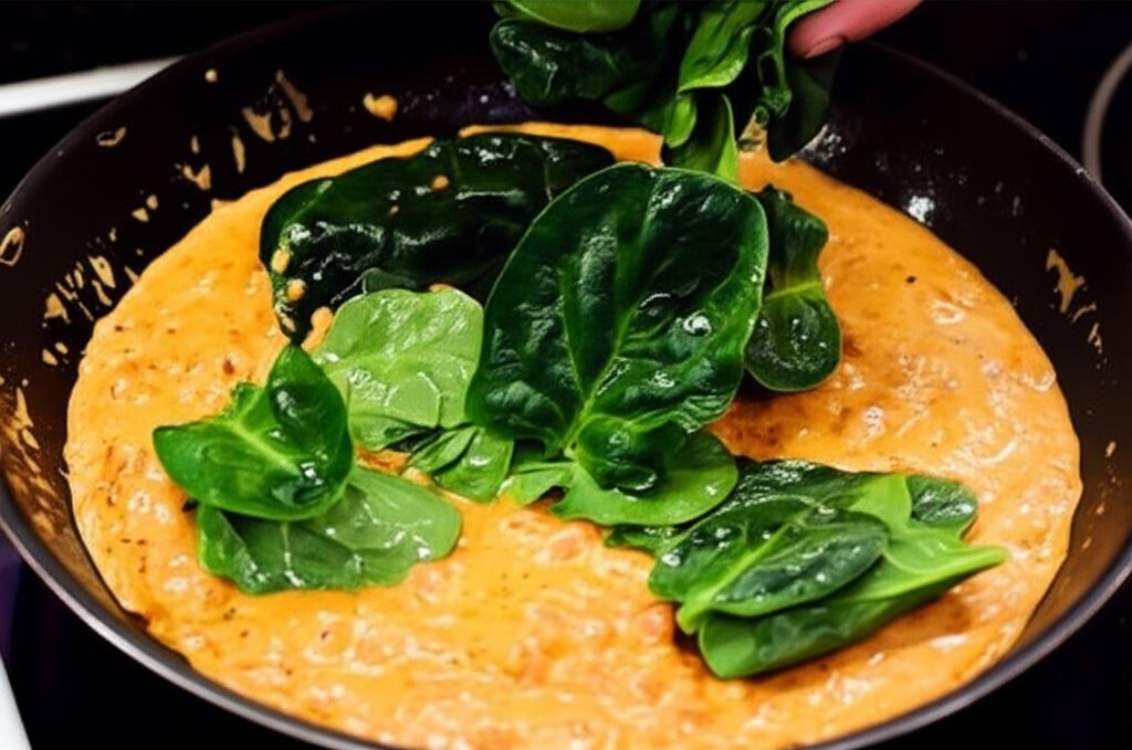 Wrzuć do sosu szpinak i gotuj jeszcze 2 minuty.