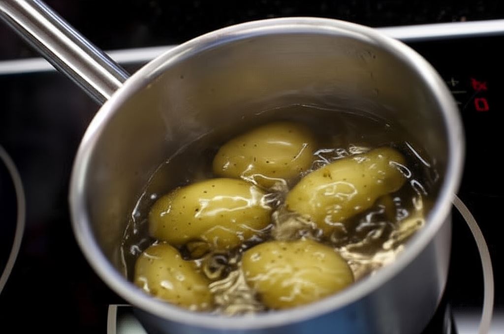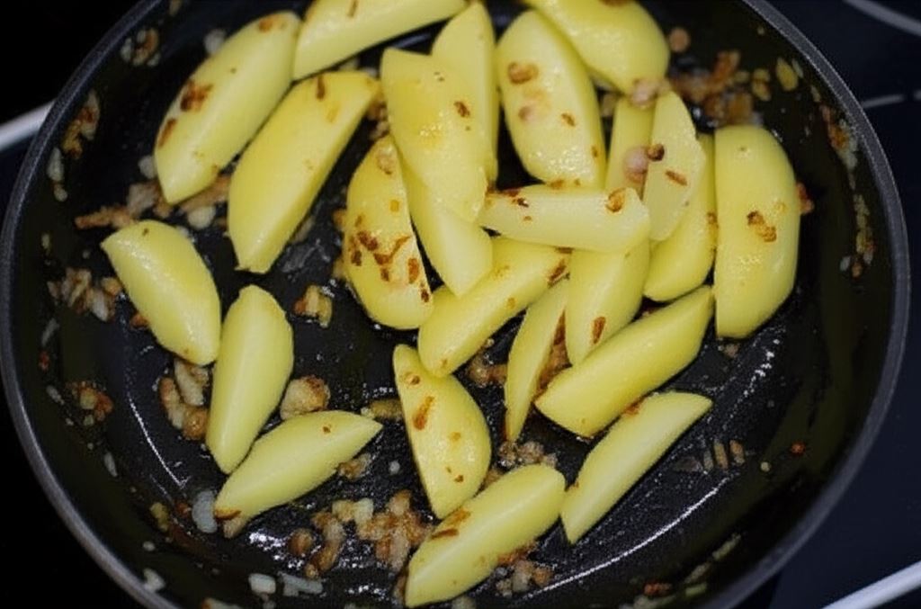 Na jednej części podsmaż pocięte ziemniaki, do drugiej wsyp łyżkę mąki.