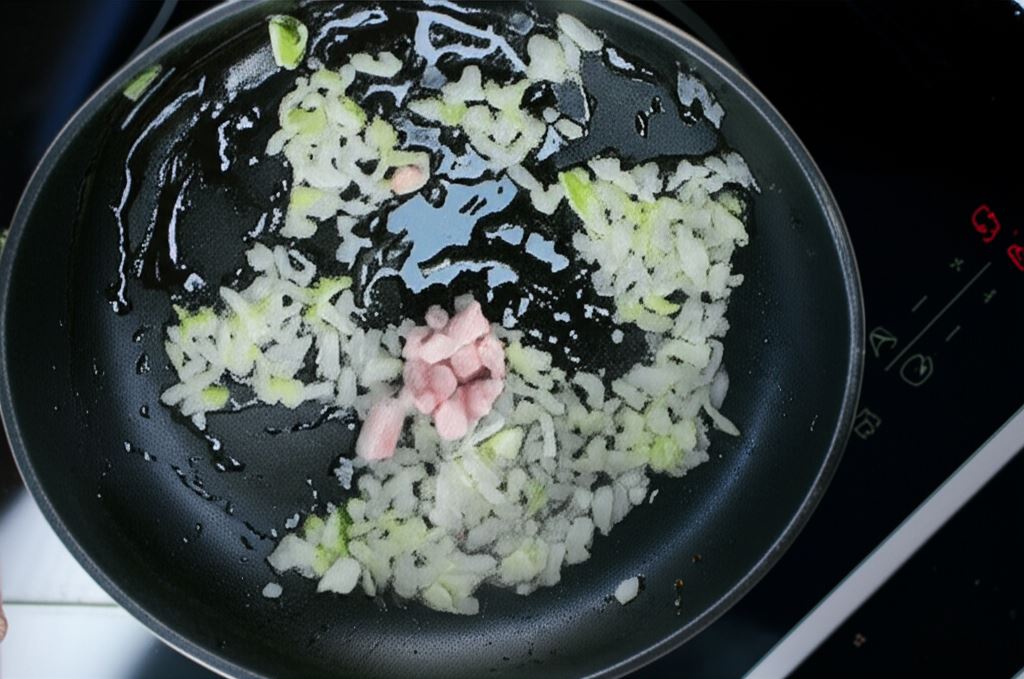 Słoninę oraz cebulę pokrój w kosteczkę, zrumień, rozdziel na dwie porcje.