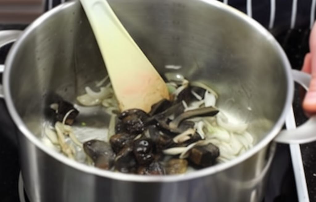 Szalotki posiekaj w cienkie piórka i zrumień w małym garnku na rozgrzanej oliwie. Borowiki i suszone podgrzybki przekrój wzdłuż na połowy, a większe okazy na ćwiartki, i podsmaż razem z szalotką.