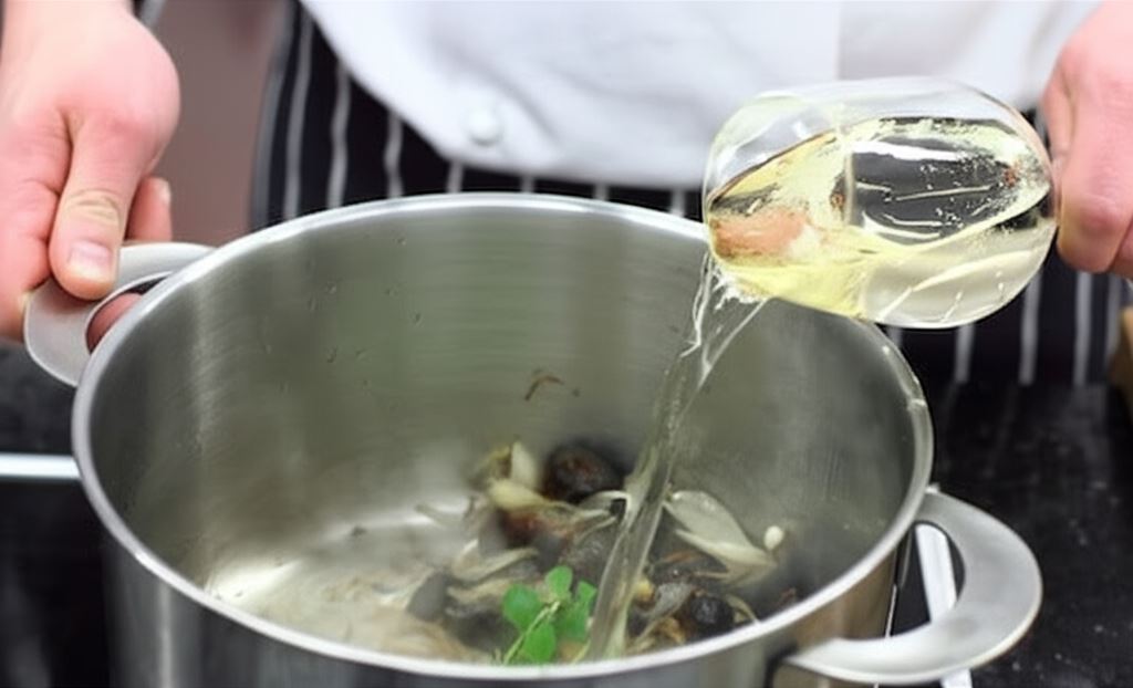 Potem do garnka dodaj wino i zredukuj jego objętość. Dodaj również gałązkę majeranku.