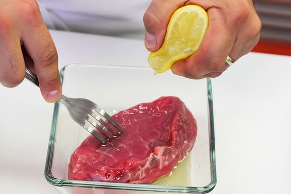 Wytnij z mięsa dwa duże steki. Ostrożnie ponakłuwaj je widelcem, potem skrop sokiem cytrynowym i oliwą z oliwek.