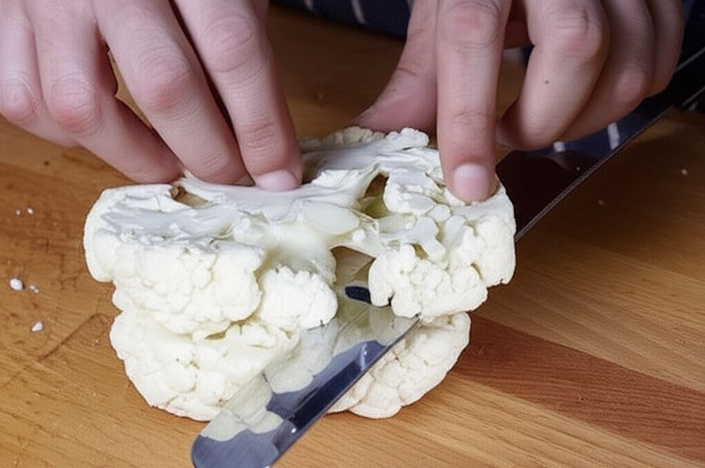 Świeżego surowego kalafiora potnij na plastry o grubości około 2 cm.