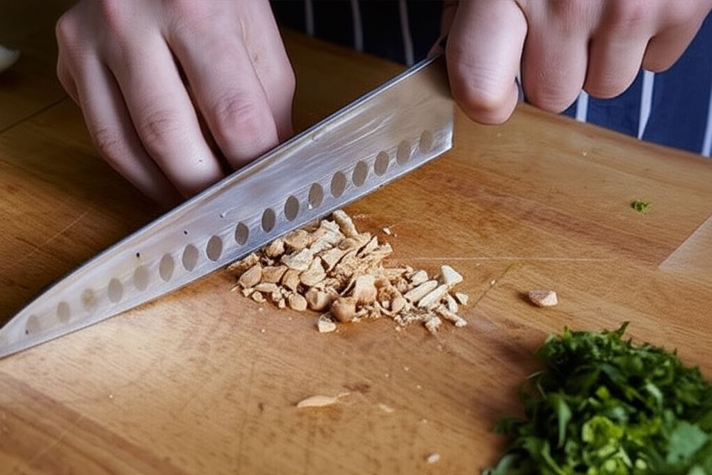 Przygotuj deskę kuchenną. Natkę i bazylię opłucz pod bieżącą wodą i osusz papierowym ręcznikiem lub kuchenną ścierką. Zioła oraz orzechy drobno posiekaj.
