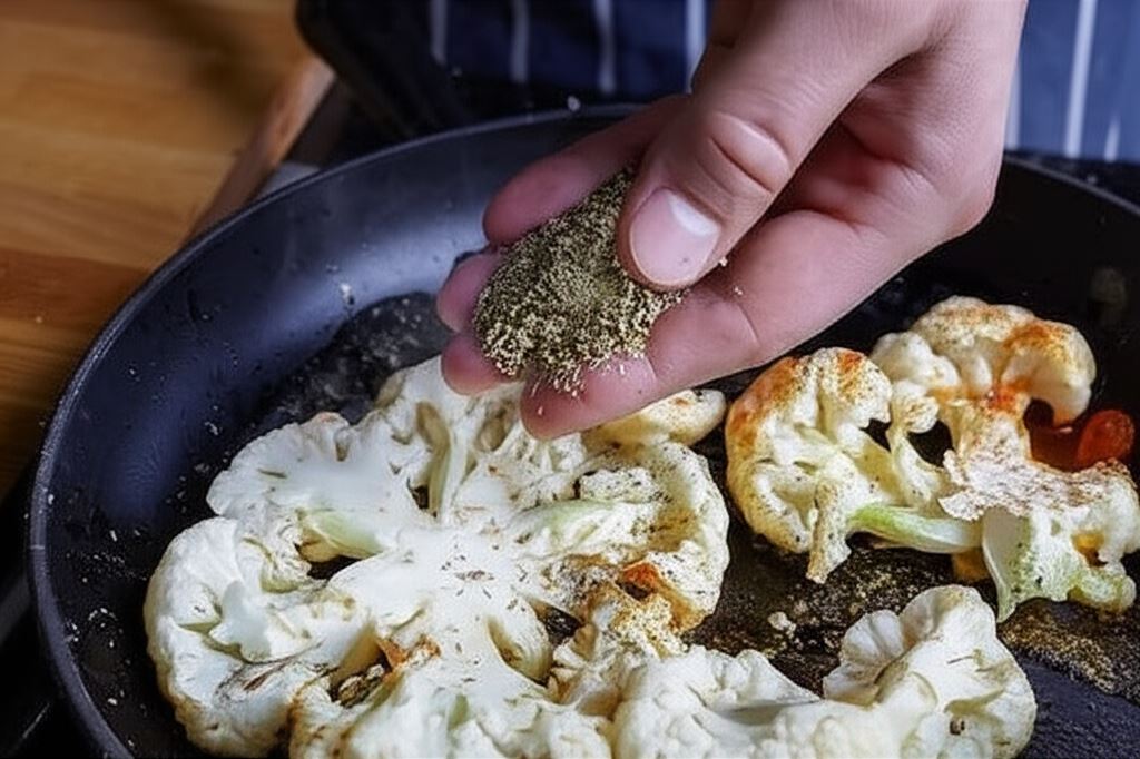 Przy końcu smażenia przypraw stek kalafiorowy odrobiną soli i Przyprawą płatki chilli z wędzoną papryką Knorr.