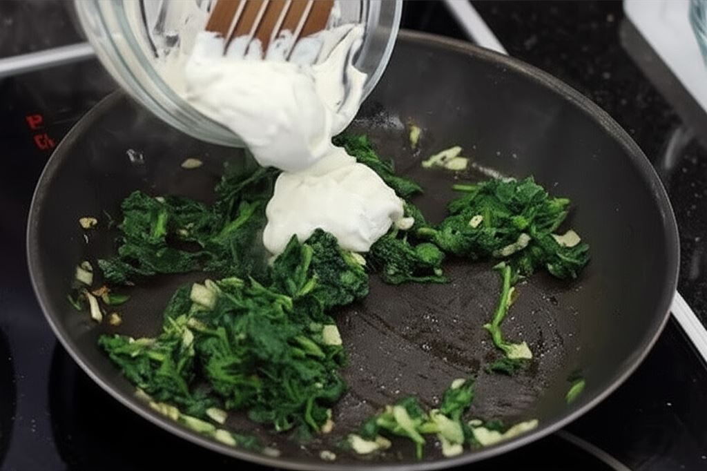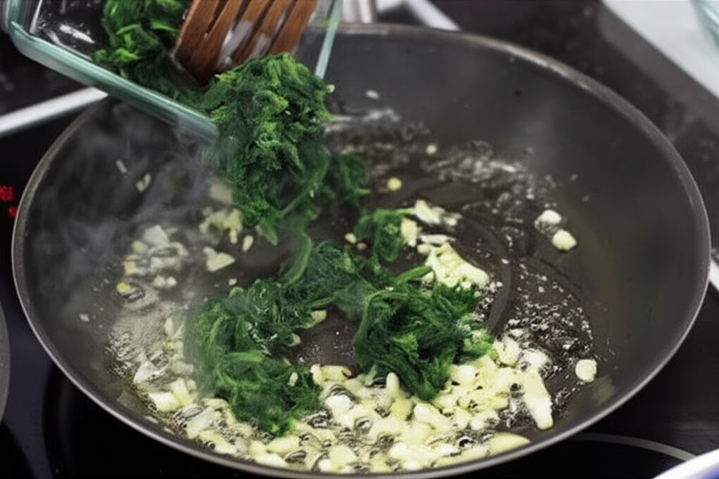 W międzyczasie dokładnie umyj (lub odmroź) szpinak i odcedź go. Na patelni z margaryną zeszklij posiekany czosnek i cebulę. Następnie dodaj szpinak. Smaż przez minutę.