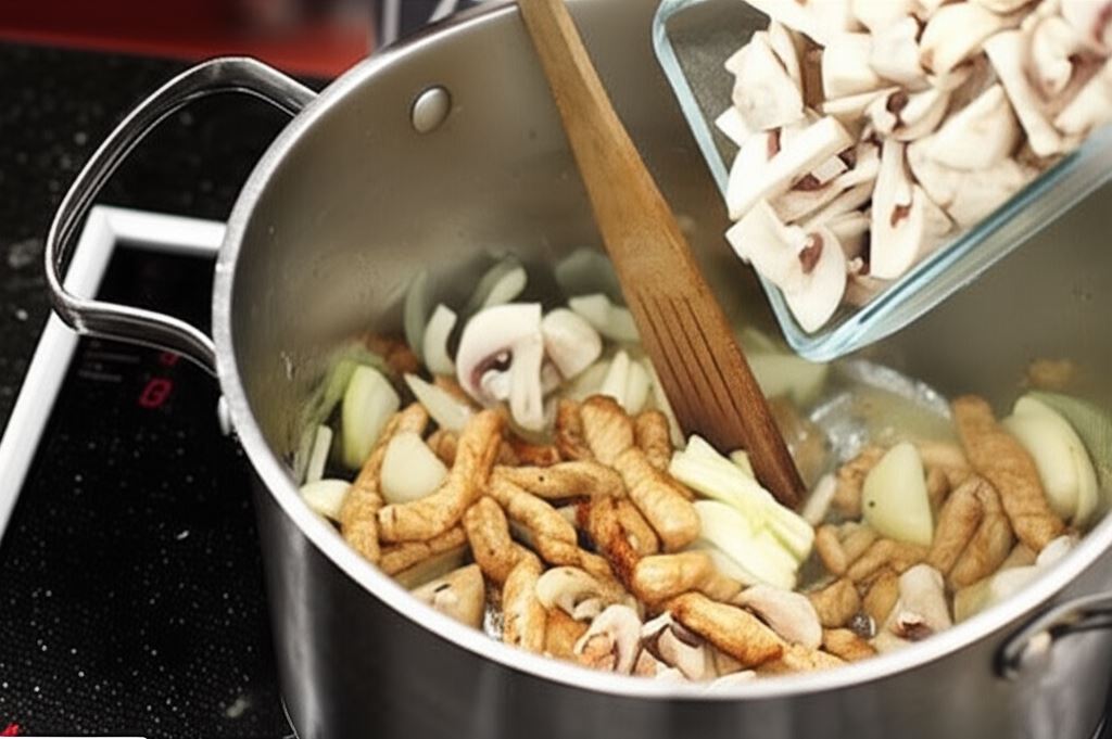 Wieprzowinę potnij w paski, posyp przyprawą Knorr i przysmaż w garnku. Pieczarki pokrój na ósemki, cebulę na grube plastry i dodaj na patelnię. Smaż przez moment.