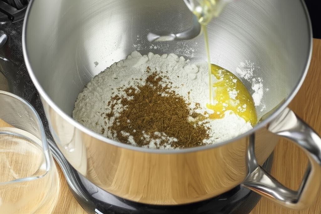 Sporządź ciasto. Wszystkie składniki na ciasto połącz w misie robota kuchennego i wymieszaj ciasto przy użyciu haka. Gotowe ciasto nakryj ściereczką i pozostaw do wyrośnięcia na 1h.