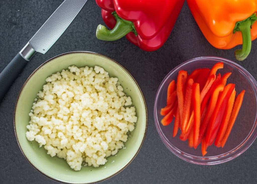 W międzyczasie pokrój obie papryki na paski, a ser zetrzyj na tarce.
