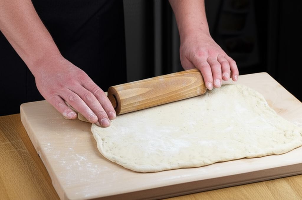 Wyrosłe ciasto przenieś na stolnicę i rozwałkuj na prostokąt o wymiarach 30x40 cm.
