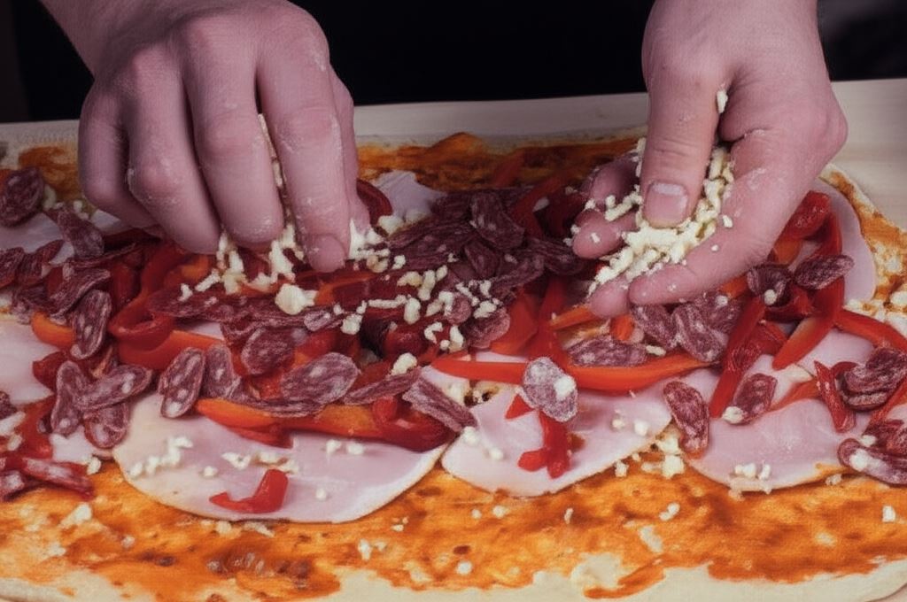 Przygotowany placek posmaruj sosem, posyp połową sera, potem ułóż plastry pepperoni, plastry szynki, paski papryki i posyp resztą sera.