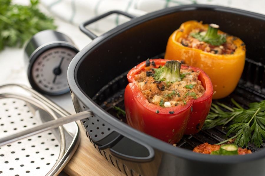 Papryka faszerowana przygotowana w air fryerze zachowuje intensywny smak i aromat, jednocześnie zyskując charakterystyczną chrupkość na powierzchni, której trudno dostać przy tradycyjnych metodach gotowania.