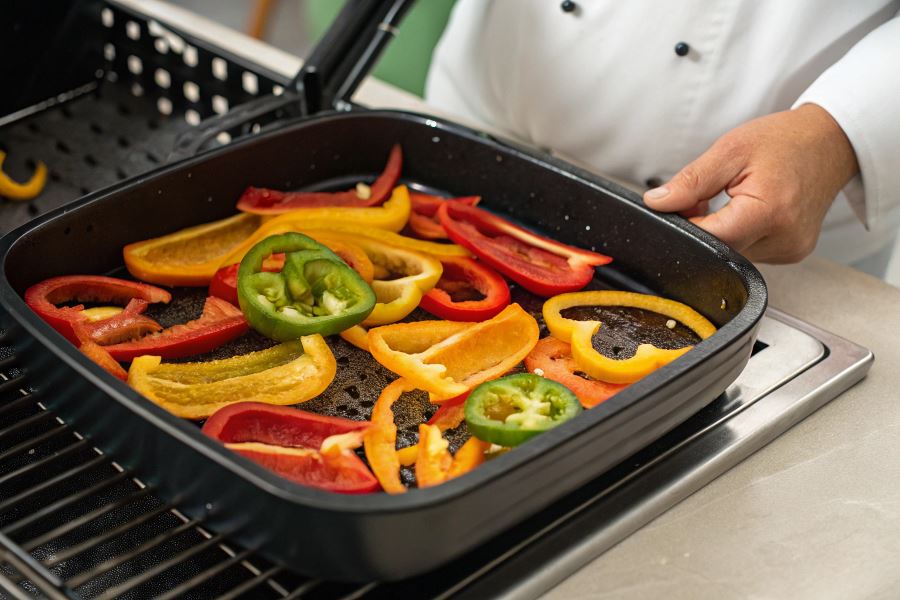 - Papryka pokrojona w kawałki: 180°C przez 8-10 minut, mieszając w połowie czasu