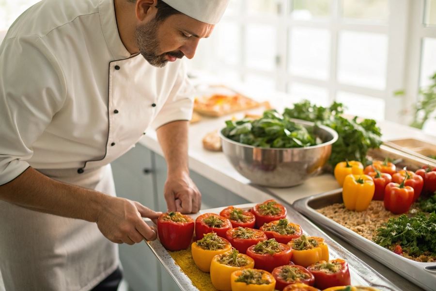 Najlepszą techniką gotowania jest pieczenie w temperaturze 180°C przez pierwsze 30 minut pod przykryciem (folia aluminiowa), a następnie 15-20 minut bez przykrycia dla uzyskania apetycznej, lekko przyrumienionej powierzchni. Podlewanie papryk podczas pieczenia sosem pomidorowym z dodatkiem bulionu warzywnego zapewnia, że pozostaną soczyste i nabiorą głębi smaku.