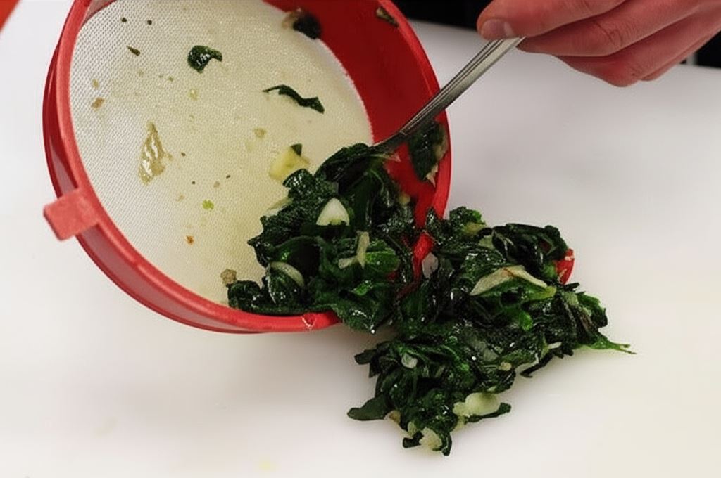 Szpinak opłucz, wysusz i usuń końcówki. Czosnek i chilli drobno posiekaj, szalotkę pokrój w małą kostkę. W garnku podgrzej łyżkę oliwy, zrumień czosnek oraz chilli, dodaj szalotkę i lekko przesmaż - tak, by składniki zachowały swój kolor. Potem wsyp szpinak i przesmaż wszystko razem. Dopraw szpinak solą do smaku, jeśli uznasz to za potrzebne. Następnie ostudź szpinak, wyciśnij z niego nadmiar płynu i dokładnie posiekaj.