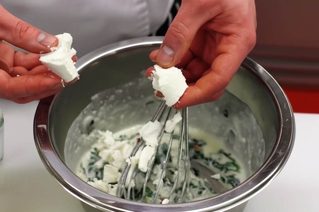 W innym garnku podgrzej pozostałą oliwę, wsyp do niej mąkę i krótko podsmaż - tak, by nie zmieniła barwy. Potem, ciągle mieszając, dolewaj mleko. Doprowadź do zagotowania i gotuj, stale mieszając - aż do momentu, gdy sos zgęstnieje. Uzyskany sos połącz z mieszanką szpinakową i dodaj pokruszony kozi ser oraz starty parmezan.