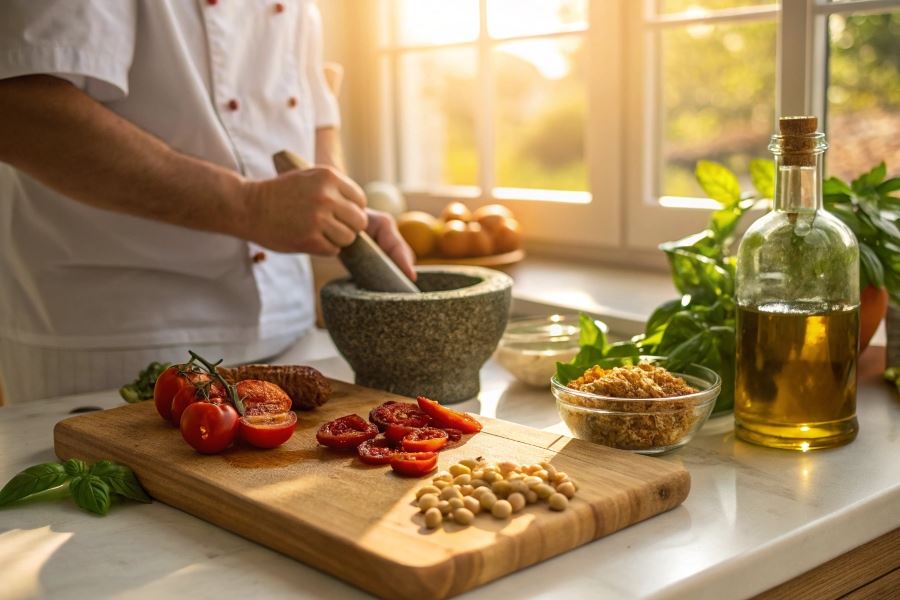 Pesto z suszonych pomidorów to intensywna w smaku pasta, która zachwyca głębokim aromatem i wszechstronnością zastosowań. Do przygotowania potrzebujesz: