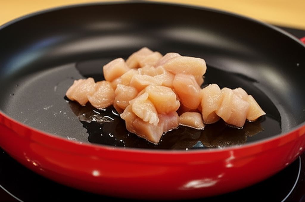 Kurczaka pierś pokrój w kostkę 1x1 cm. Rozgrzej olej na patelni i usmaż mięso pokrojone.