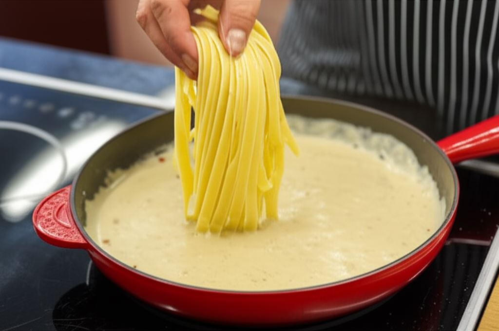Do jasnego sosu śmietanowego znakomicie pasuje czarne tagliatelle, które nada potrawie wyjątkowy, elegancki wygląd bez zmiany smaku. Aby sos idealnie połączył się z makaronem, warto dokładnie wymieszać składniki jeszcze na patelni. Każdą porcję najlepiej posypać świeżo startym parmezanem lub mozzarellą dla dodatkowego aromatu.