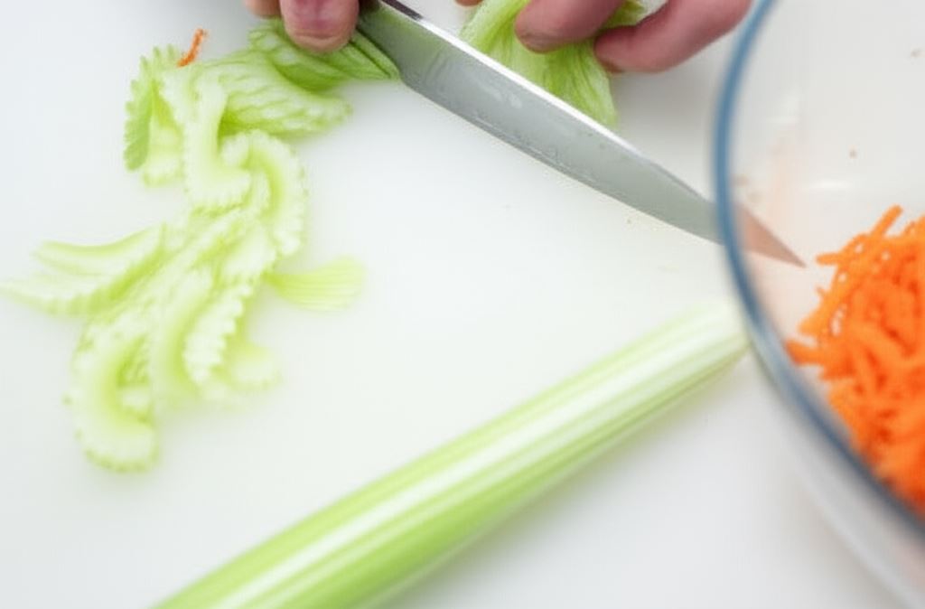 Zetrzyj marchew na grubych oczkach tarki. Posiekaj seler naciowy. Obierz pomarańcze i pokrój je.