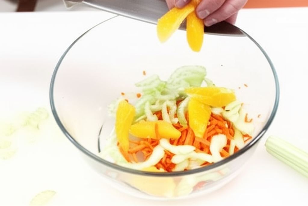 Szukasz odmiany od klasycznej surówki z marchewki? Nasza orzeźwiająca kompozycja z dodatkiem soczystej pomarańczy i chrupiącego selera naciowego to prawdziwa eksplozja smaków i witamin! Delikatny sos na bazie majonezu i śmietany, doprawiony aromatyczną pietruszką, idealnie łączy wszystkie składniki, tworząc harmonijną całość.