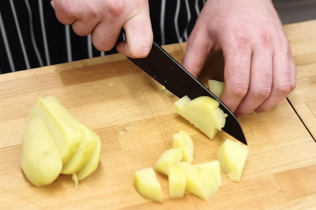 Ziemniaki obierz, opłucz i ugotuj aż będą miękkie. Gdy ostygną, pokrój je w większe kostki.