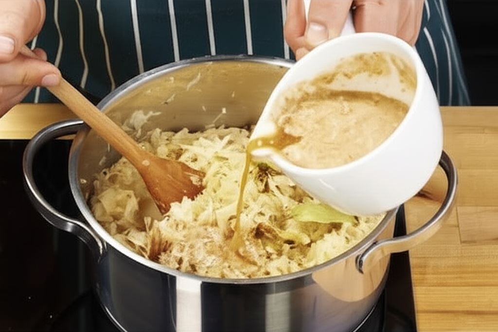 Kiedy kapusta zmięknie, dodaj uprzednio przygotowany sos. Całość starannie wymieszaj i duś, aż bigos stanie się gęsty.