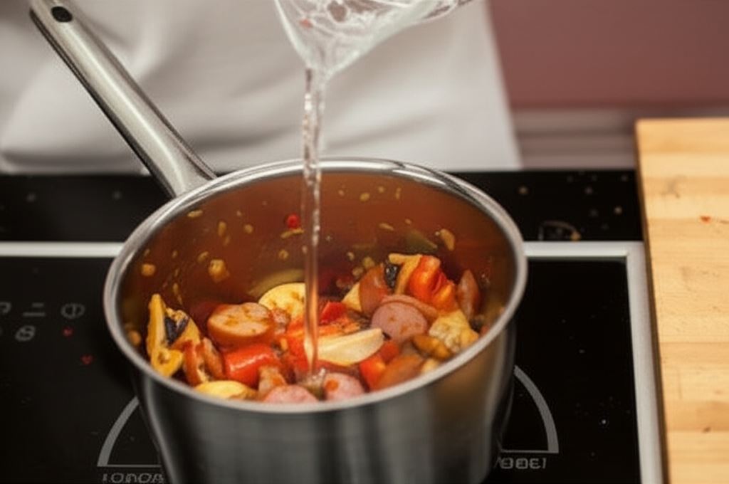 Wsyp drobno posiekaną papryczkę chili, słodką paprykę w proszku i pokrojoną w półplasterki kiełbasę.