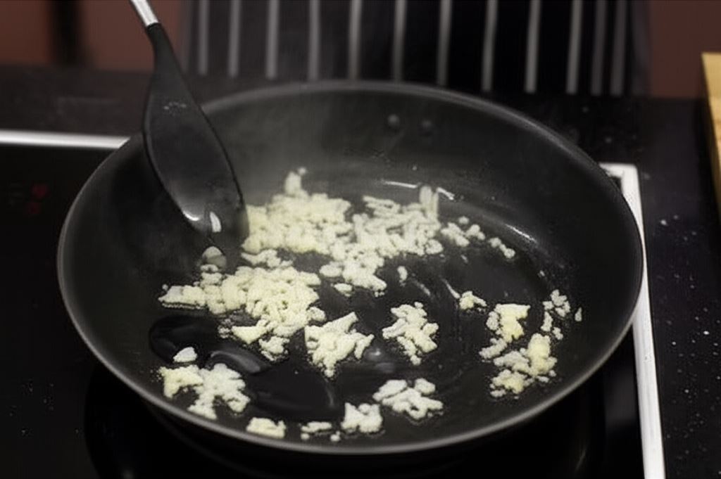 Na patelni podgrzej olej i zrumień posiekany czosnek i cebulę.