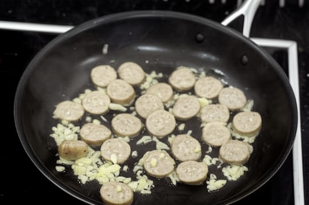 Po chwili wrzuć kiełbasę pokrojoną na plastry.