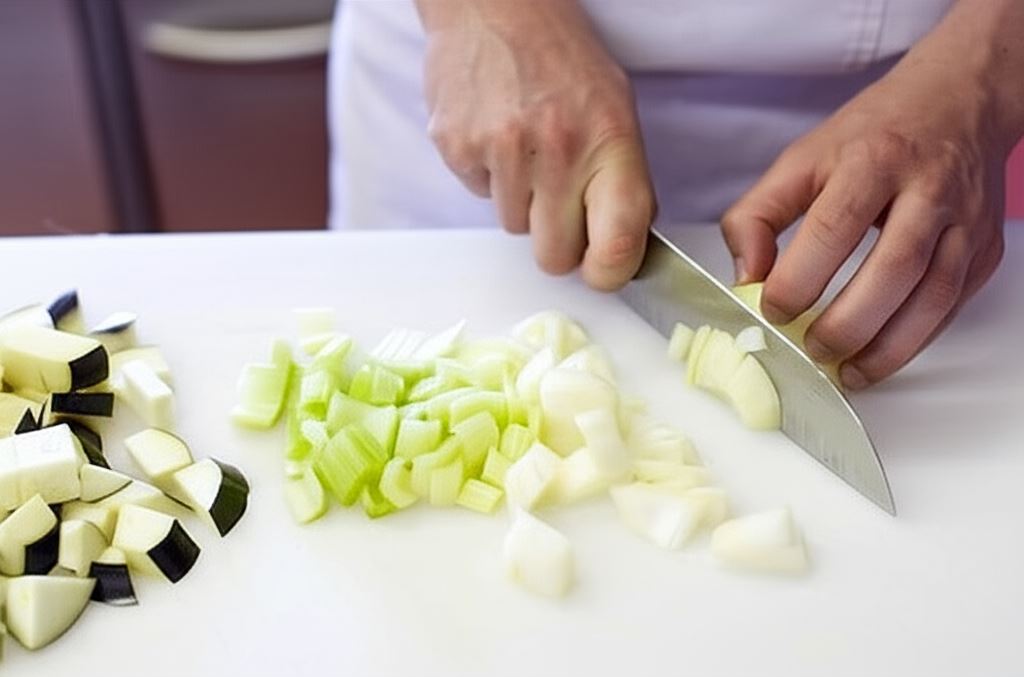 Bakłażany potnij na plastry. Potem w dużą kostkę o wymiarze 1 centymetra. W podobny sposób potnij cebule i selera.