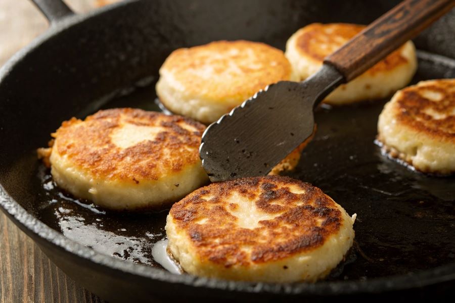 Nacisk palcem – przy odpowiedniej ostrożności możesz delikatnie nacisnąć środek syrnika. Gotowy syrnik będzie sprężysty, ale stabilny. Jeśli wyczuwasz, że środek jest zbyt miękki lub płynny, potrzebuje jeszcze kilku minut smażenia.