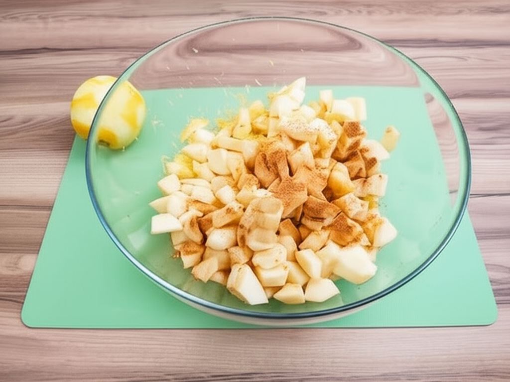 Obierz i drobno posiekaj jabłka. Zetrzyj na nie skórkę cytrynową i oprósz cynamonem. W rondelku roztop masło. Dodaj jabłka. Duś bez pokrywki aż jabłka zaczną się rozpadać. Ostudź.