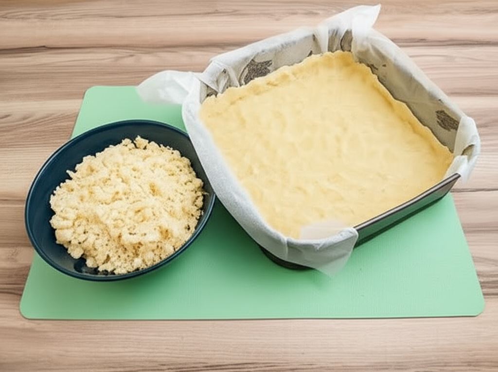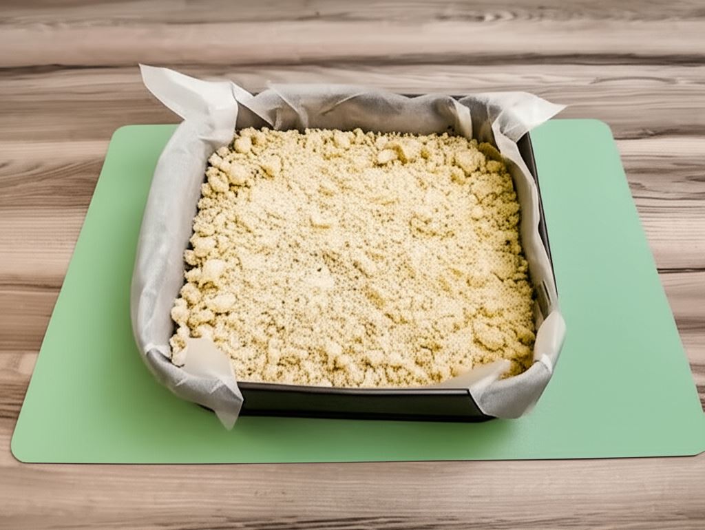 Połową ciasta wyłożyć formę do tortu tworząc brzeg o wysokości około 1 cm. Formę oraz pozostałą część ciasta umieścić w lodówce na godzinę.